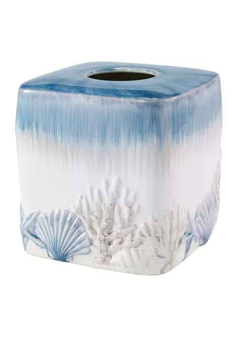 Decorate your bathroom oasis with the beautiful coastal flair of the Avanti Abstract Coastal Tissue Box Cover. The ceramic figural piece features a design of coral, starfish, and shells with hand-painted detailing in blue and beige brushstrokes.
