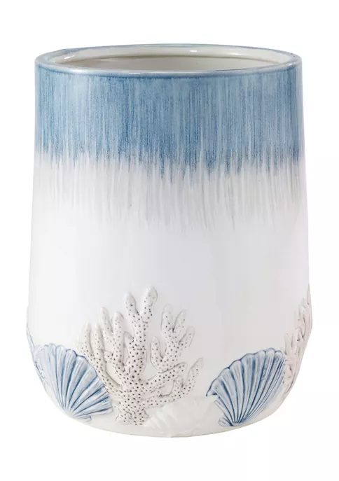 Decorate your bathroom oasis with the beautiful coastal flair of the Avanti Abstract Coastal Wastebasket. The ceramic figural piece features a design of coral, starfish, and shells with hand-painted detailing in blue and beige brushstrokes.