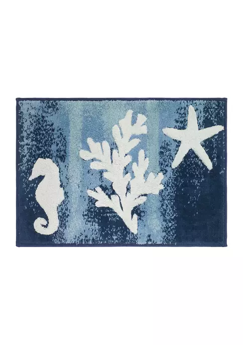 The Avanti Batik Coastal Collection Bath Mats and Rugs is decorated with ocean icons-coral, a starfish, and a seahorse-on an ombrรฉd navy blue ground. Hand-tufted in 100% cotton, 20-inch by 30-inch with non-slip backing. Coordinates with the matching shower curtain, shower curtain hooks, and towels.