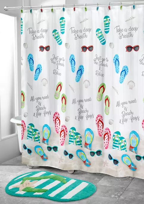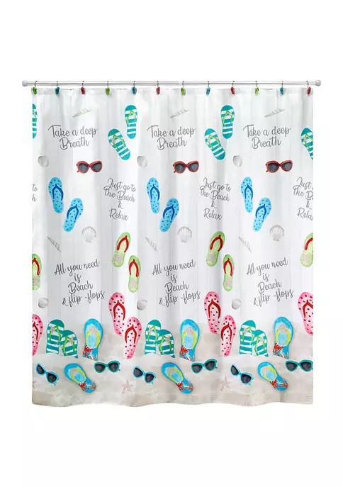 Bring the beach to your bathroom with the Avanti Beach Mode Shower Curtain. This charming shower curtain features a white shiplap design with a sand bottom and is decorated with beach sayings, flip-flops in blue, green, and pink, and sunglasses.