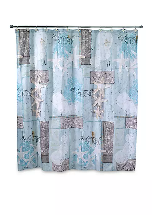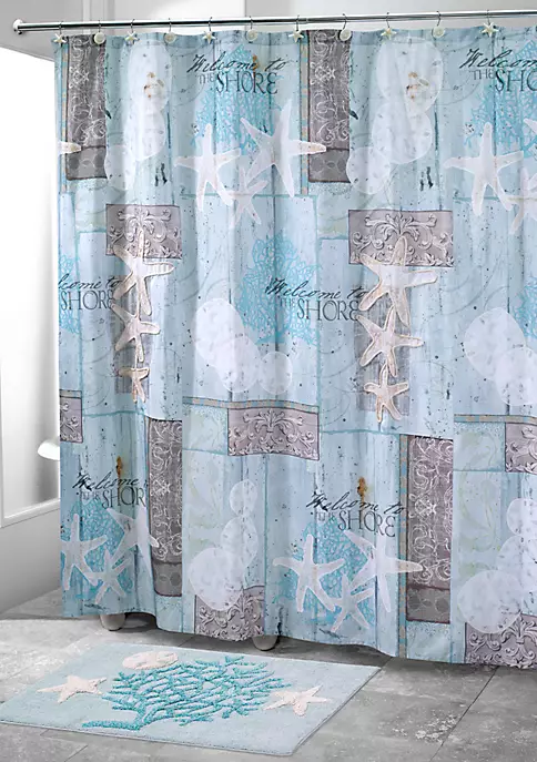 The Avanti Beachcomber Shower Curtain features a beautifully printed seascape with starfish, coral and sand dollars in shades of mauve, ivory, white, aqua and teal.