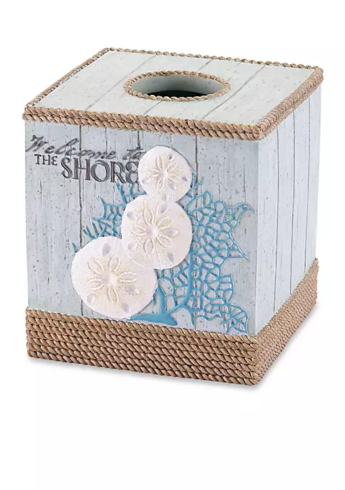 The Avanti Beachcomber Tissue Cover is crafted in resin for incredible detail. The coral and sand dollar motif is set off beautifully on an aqua clapboard background, finished with rope detail top and bottom.