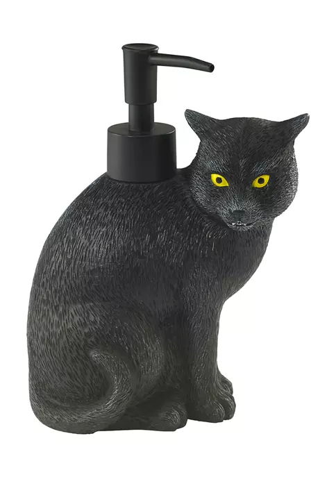 The Avanti Black Cat Decorative Lotion/ Soap/ Sanitizer Dispenser is a realistic-looking black cat with yellow, piercing eyes, a curled tail and serious stare. Made of durable, hand-painted resin. Brings a bit of Halloween spirit to any bathroom or kitchen.