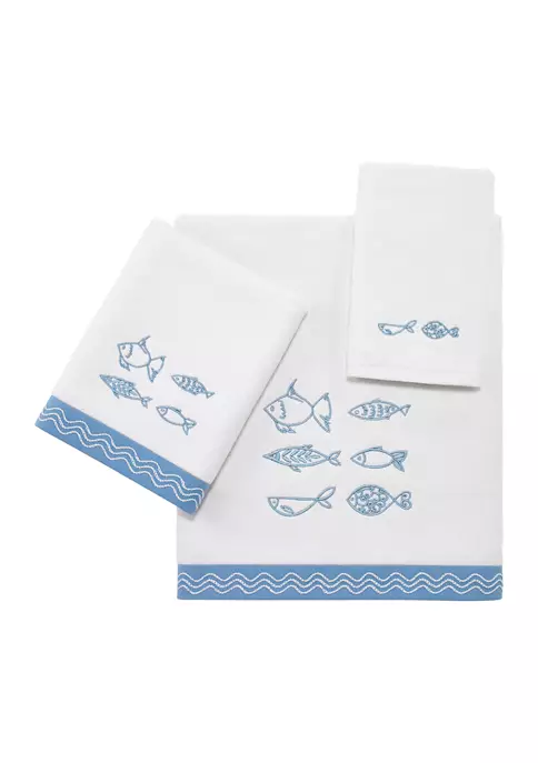 The Avanti Blue Fin Bay 3 Pc. Decorative Towel Set features embroidered fish in medium blue on a white ground. The towel is 100% cotton white velour face with terry back and finished with a coordinating fabric border on the bath and hand. Set includes one each of bath, hand and fingertip towel.