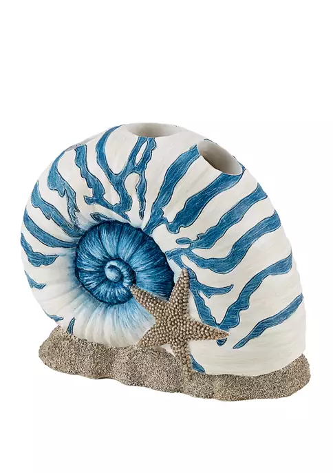 The Avanti Blue Lagoon Toothbrush Holder is a figural blue and white striped nautilus shell with a starfish on a sand base. Made of durable resin, hand-painted, it is very useful to hold a variety of objects.