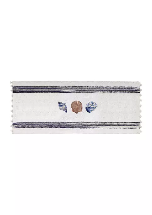 The Avanti Blue Lagoon Rug is tufted in 100% cotton and embroidered with a conch shell, fan shell and nautilus. It’s bordered top and bottom with a variegated blue stripe and finished on the sides with a ball fringe. The rug is skid resistant and machine washable.
