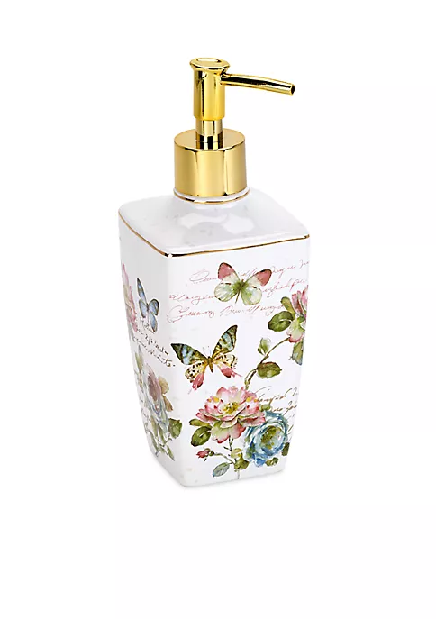 This one-of-a-kind Butterfly Garden Lotion Pump is decorated with an intricately detailed rose and butterfly design on a ceramic base and finished with gold piping. Imported. It will instantly add a touch of elegance to any bathroom, kitchen or bedroom.