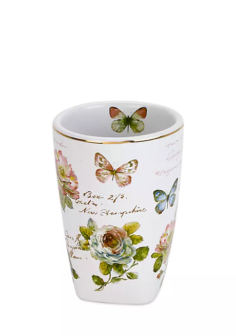 This one-of-a-kind Butterfly Garden Tumbler is decorated with an intricately detailed rose and butterfly design on a ceramic base and finished with gold piping. It will instantly add a touch of elegance to any bathroom or kitchen.