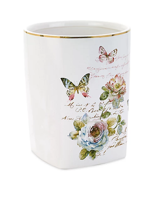 This one-of-a-kind Butterfly Garden Wastebasket is decorated with an intricately detailed rose and butterfly design on a ceramic base and finished with gold piping. It will instantly add a touch of elegance to any bathroom, kitchen or bedroom.