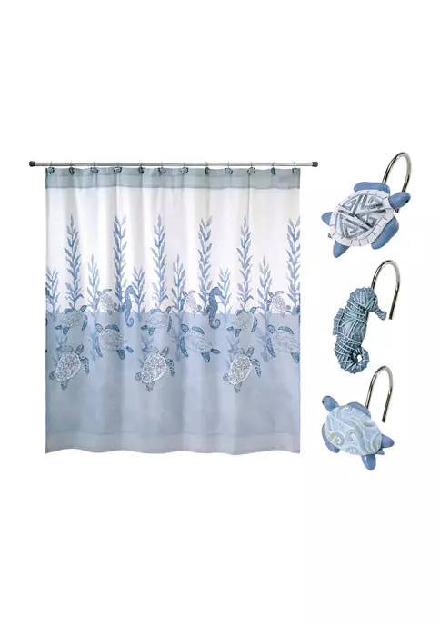 The Avanti Caicos 13-Piece Shower Curtain/Shower Hook Set features a shower curtain with a printed undersea scene with sea turtles in various shades of blue swimming among sea plants. The shower hooks are a series of 3 of the icons pulled from the shower curtain design-two sea turtles and the seahorse, the perfect finishing touch for the collection. Set includes one 72″ x 72″ 52% polyester/48% cotton shower curtain and 12 durable resin shower hooks. Imported.