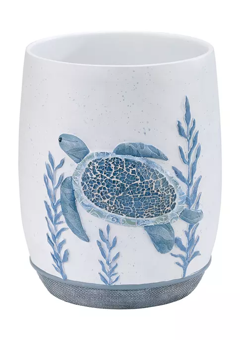The Avanti Caicos Wastebasket features a hand-painted sea turtle and seagrass in various shades of blue in relief on speckled blue and white base. The turtle’s shell is a mosaic made out of green and blue glass chips. Made of durable resin. Imported.