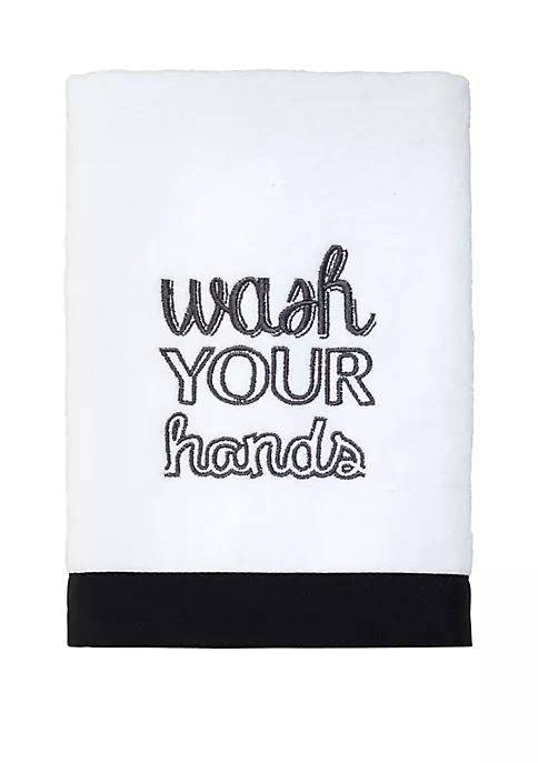 The Avanti Chalk It Up Hand Towel features ‘wash your hands’ embroidered, each word in different fonts, on a 100% cotton white sheared towel. The towel is finished with a coordinating fabric border.