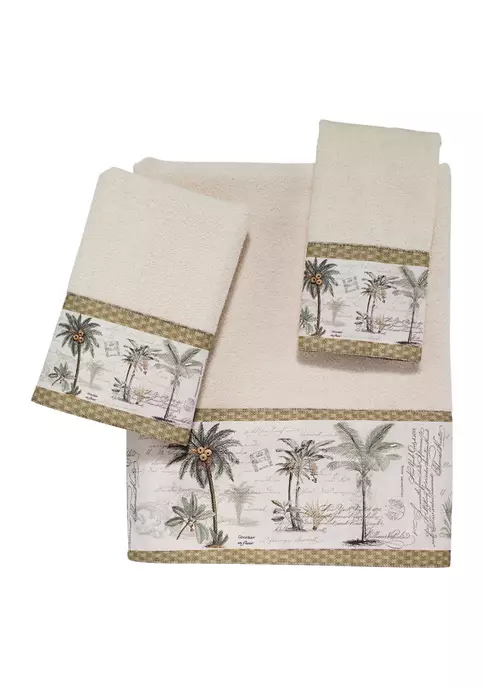 Printed with beautiful tropical palms and words with coordinating basketweave borders top and bottom and embellished with sequins on a 100% cotton (exclusive of embellishment) ivory velour towel, the Avanti Colony Palm Ivory 3-Piece Decorative Towel Set brings the feeling of the tropics to any bathroom. Set includes one each of bath, hand, and fingertip towels. Sewn in the US, imported materials.