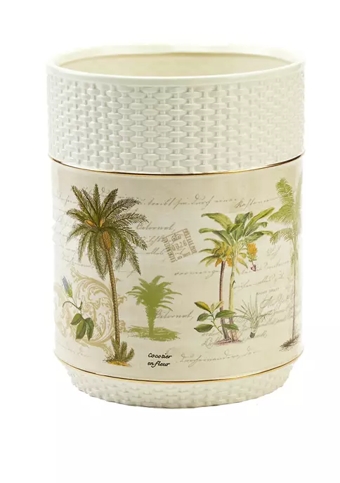 Wrapped with a beautifully detailed decal depicting palm trees and words on an ivory ceramic body with basketweave borders top and bottom and gold piping, the Avanti Colony Palm Waste Basket brings the feeling of the tropics home to any room in your house.