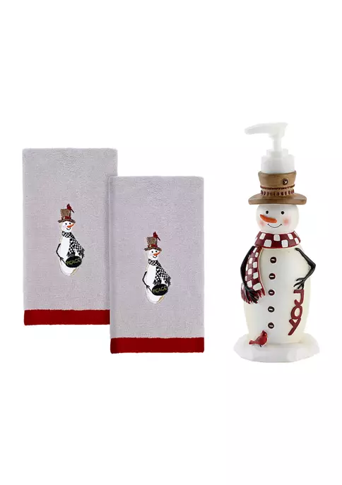 The Avanti Country Friends 3-Piece Soap / Lotion Dispenser & 2 Fingertip Towel Set features a figural, happy snowman dispenser with a carrot nose, burgundy scarf with white dots. Made of durable resin, hand painted. The 2 embroidered 11-inch by 18-inch light gray velour towels are made of 100% cotton.