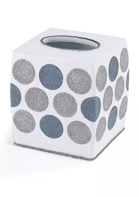 Beautifully executed in gray and blue with metallic accents on a white base in durable resin, the Avanti Dotted Circles Tissue Cover adds a contemporary flair to any bathroom, bedroom, kitchen, or office. Coordinating shower curtain, rug and towels also available.