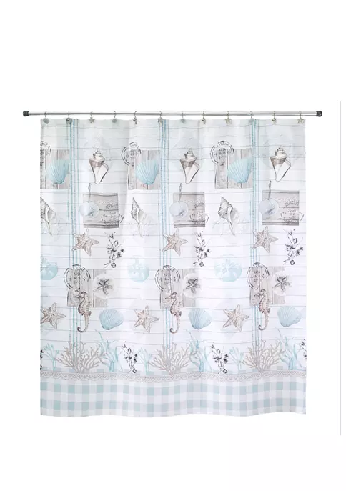 The Farmhouse Shell Printed Shower Curtain from Avanti features a collection of sea creatures, shells, starfish, seahorses, and coral in pleasing shades of blues and beiges on an off-white, textured shiplap background. The bottom of the curtain is bordered with a blue and white buffalo check with printed ivory lace trim.