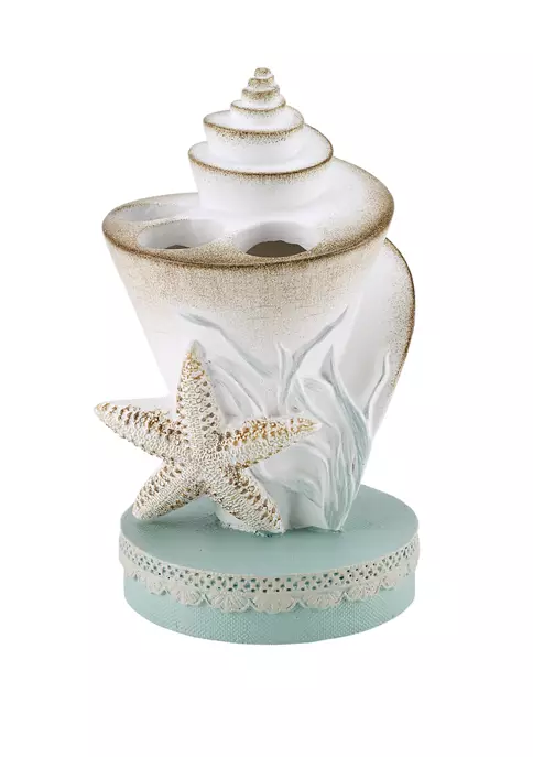 The Avanti Farmhouse Shell Toothbrush Holder is a figural conch shell in shades of beige with a starfish attached to its base and blue coral. The base is light blue with blue and ivory lace.