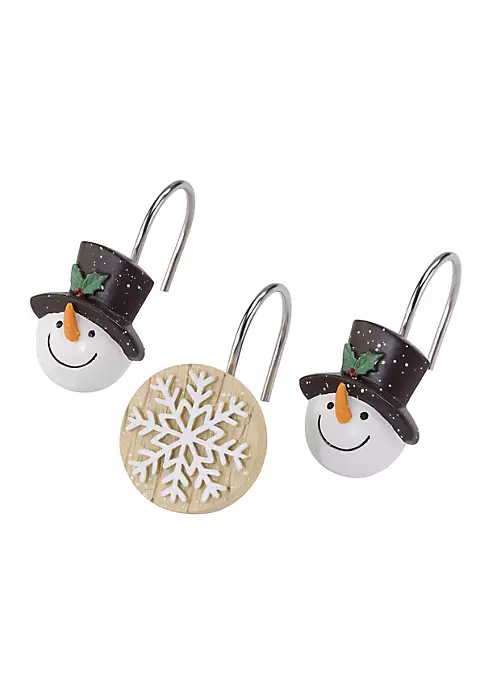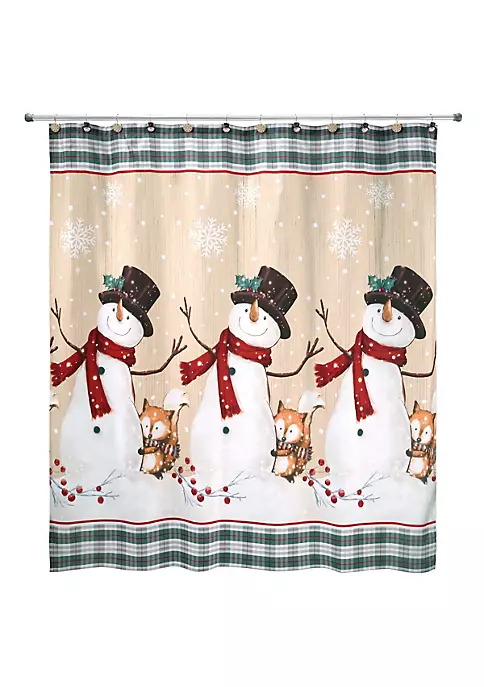 The Avanti Friends Gather 13 Pc Shower Curtain & Hook Set features a 72″ x 72″ polyester printed curtain decorated with 3 scarved snowmen and red foxes. The background is a faux beige woodgrain with green plaid borders. The 12 hand-painted resin hooks include 6 each of the snowman and snowflake.
