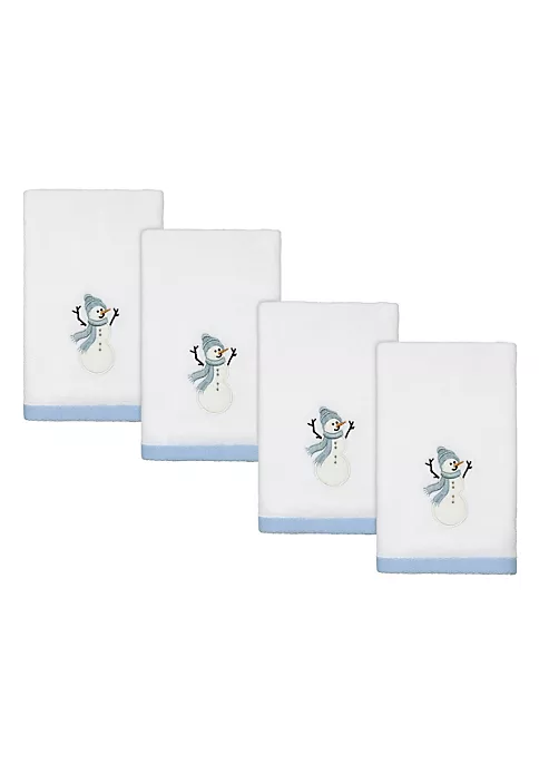 The Avanti Frosty Friends 4-Pc. Decorative Fingertip Towel Set features an embroidered happy snowman with blue hat and scarf with white bodies. A carrot nose and arms made out of branches finishes the look. Includes four 100% cotton 11″ x 18″ white velour towels with blue woven polyester border.