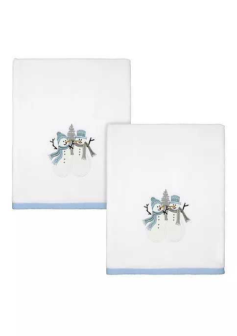 The Avanti Frosty Friends 2-Pc. Decorative Bath Towel Set features embroidered happy snowmen with blue hats and blue and grey scarves with white bodies. A grey pine tree sits in the background. Includes two 100% cotton 27″ x 50″ white velour towels with blue woven polyester border.