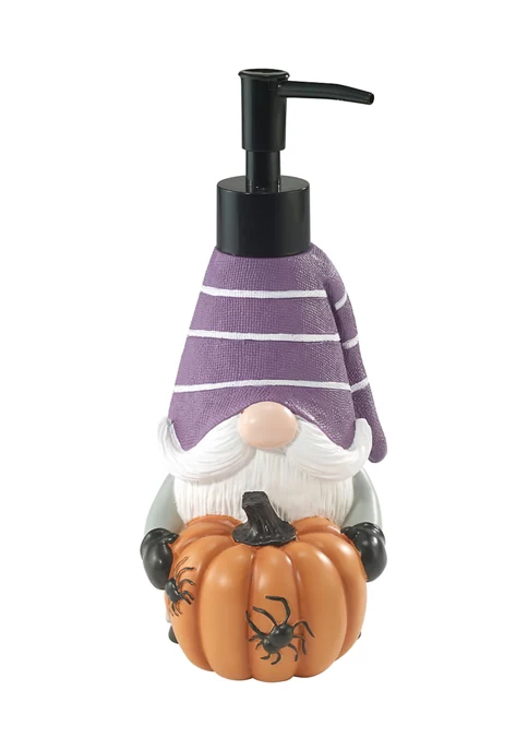 The Avanti Gnome with Purple Hat Decorative Lotion/ Soap/ Sanitizer Dispenser is a white-bearded gnome with purple and white striped hat. Two spiders are crawling on the orange pumpkin. Made of durable, hand-painted resin.