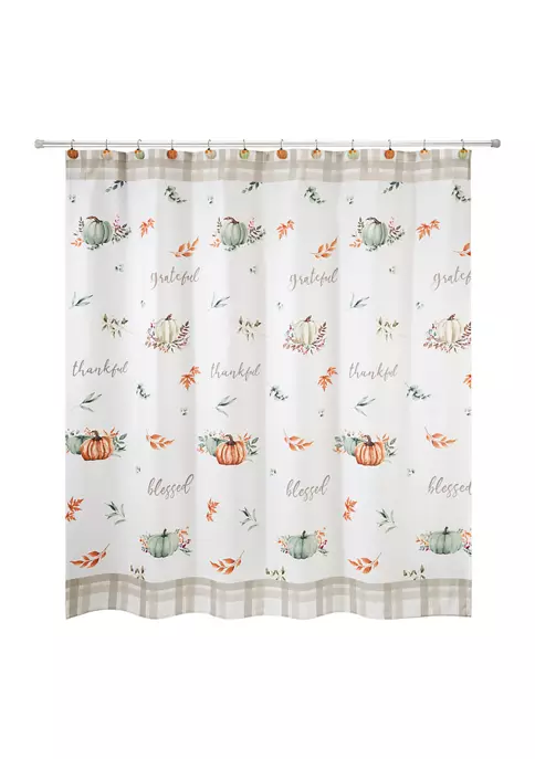 The Avanti Grateful Patch Shower Curtain features pumpkins in orange, aqua, and sage with fall foliage and “grateful”, “thankful” and “blessed” on an off-white ground. Linen and off-white plaid border the curtain top and bottom. Beautifully printed on 100% polyester for easy care.