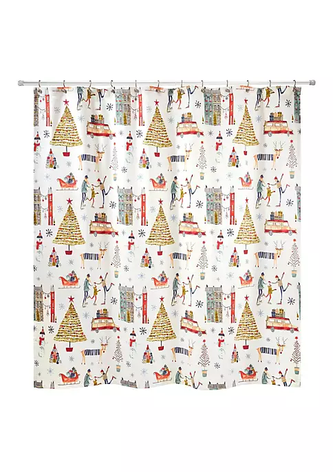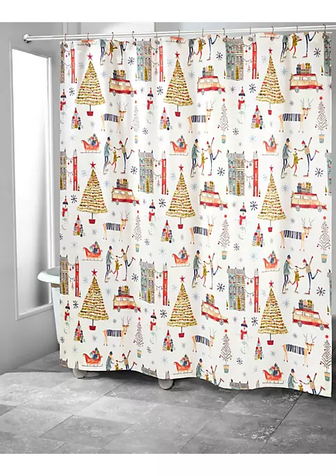 The Avanti Holiday Town Shower Curtain depicts a festive, colorful collection of holiday icons and scenes including a Christmas tree, snowman, station wagon, sleigh, skaters, snowman and reindeer. Printed on a 52% polyester, 48% cotton heavyweight, off-white canvas-like cloth. 72″ x 72″. easy care.