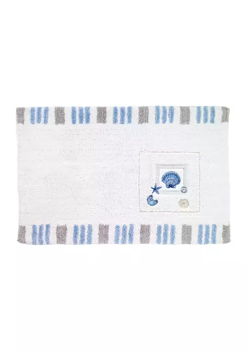 The Avanti Island View Rug is tufted in 100% cotton. The shell motif is embroidered off-center with a tufted striped border on top and bottom.