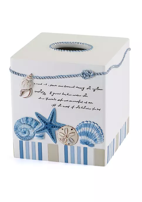 The Avanti Island View Tissue Cover features a shell and starfish motif in shades of blues and beige on white ground. Made in resin, the intricately detailed pieces are finished with a coordinating vertical striped border.