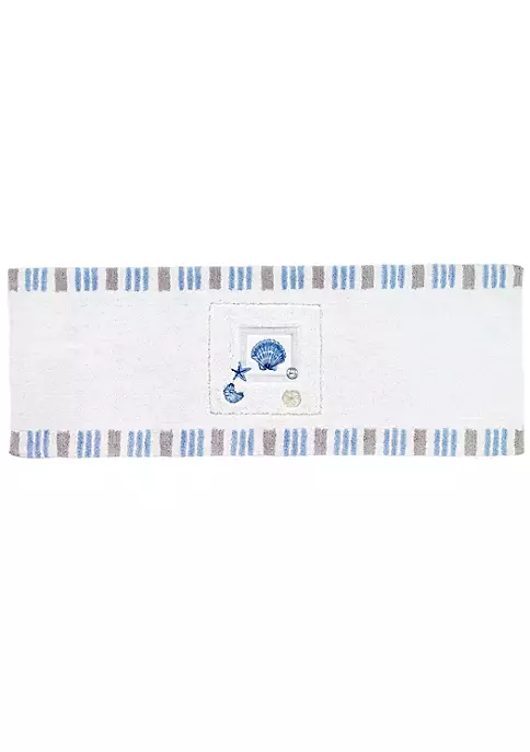 The Avanti Island View Rug is tufted in 100% cotton. The shell motif is embroidered off-center with a tufted striped border top and bottom. This oversized rug is skid resistant and machine washable.