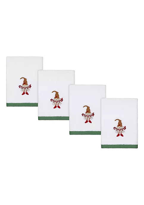 The Avanti Merry Gnome Decorative 4-Pc. Fingertip Towel Set feature an embroidered festive gnome dressed in holiday hat, pants and shoes holding banners that say “Merry”. The four 100% cotton velour white towels are finished with a woven green polyester border. 11″ x 18″, machine washable.
