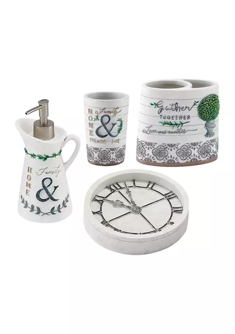 The Avanti Modern Farmhouse 4-Piece Bath Accessory Set features items decorated with the farmhouse theme including words and sayings, along with icons. The lotion dispenser is in the shape of a milk pitcher. Made of durable hand painted resin. Set includes one each of tumbler, toothbrush holder, soap dish and lotion dispenser.