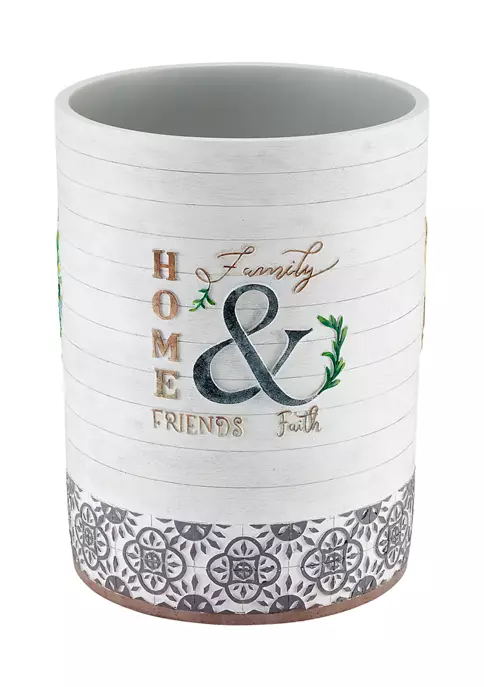 The Avanti Modern Farmhouse Wastebasket is adorned with icons, words, and phrases with a shiplap background and a floor tile border to bring one of today’s most popular decorating motifs to your home. Crafted in great detail in hand-painted resin, imported.