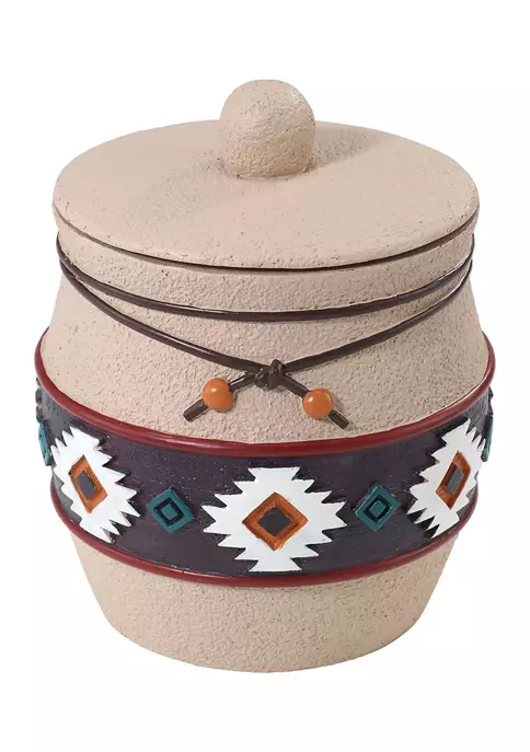 The Avanti Navajo Dance Covered Jar features southwest symbols in teal, brown and orange and brick borders on a beige textured ground. The top of the base is decorated with a brown rope detail. Made of durable, hand-painted resin for long-lasting use.