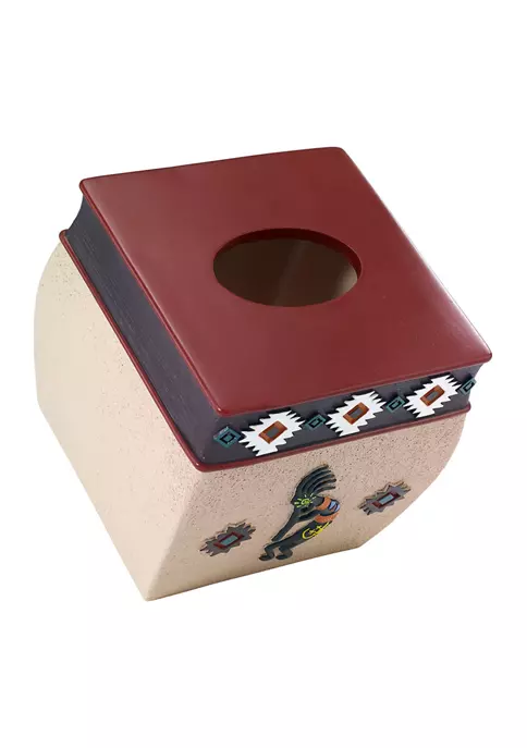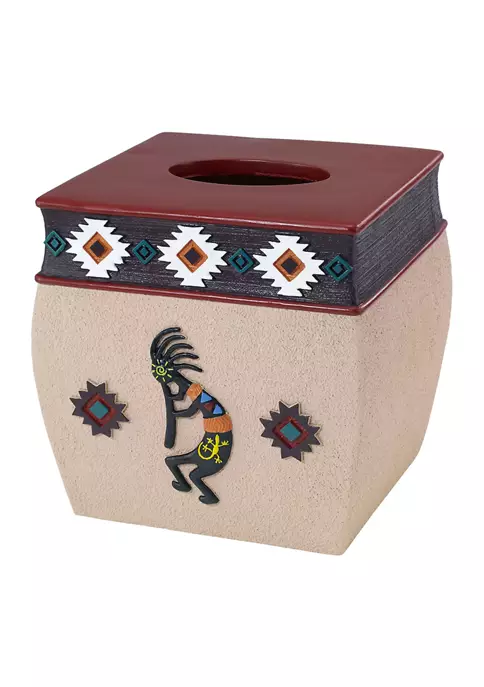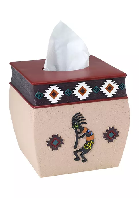 The Avanti Navajo Dance Tissue Box Cover features a flute-playing Kokopelli in brown with colorful accents and southwest symbols on a beige textured ground. The top is decorated with a brown border with more of the southwest symbols. Made of durable, hand-painted resin for long-lasting use.