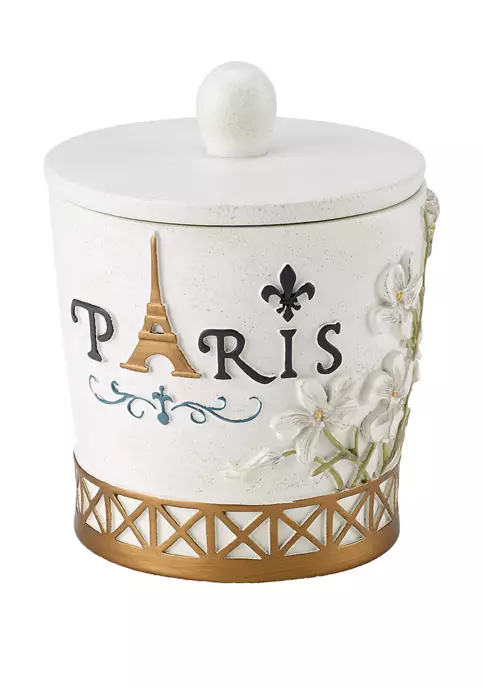 The Avanti Paris Botanique Covered Jar features the word “Paris” written with an Eiffel Tower A and flowers in relief in shades of taupe and gray on an off-white base. The bottom is bordered with a gold grid pulled from the Eiffel Tower.