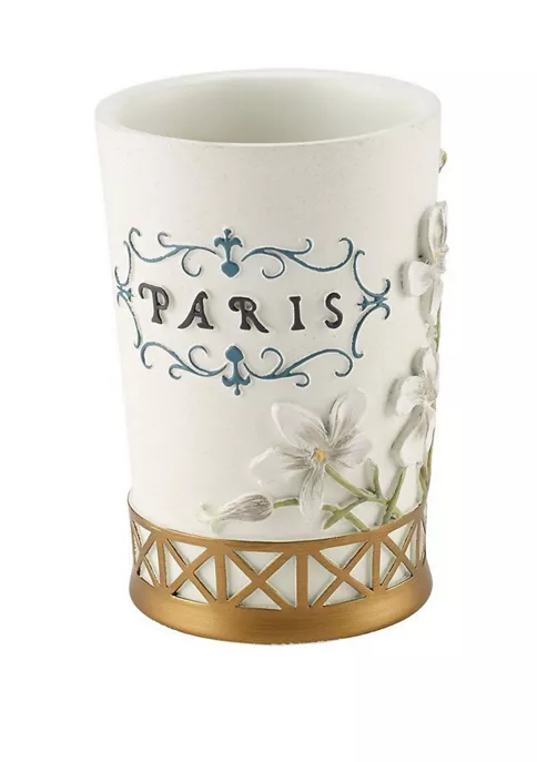 The Avanti Paris Botanique Tumbler features “Paris” in gray with an Eiffel Tower and flowers in relief in neutral shades on an off-white base. The bottom is bordered with a gold grid.