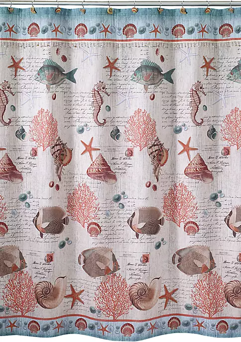 Create effortless under-the-sea style in your coastal bathroom with this one-of-a-kind shower curtain. Featuring beautifully colored seashells, coral, and fish accented with script writing on an ivory background, this incredible essential is primed to refresh your bathroom basics.