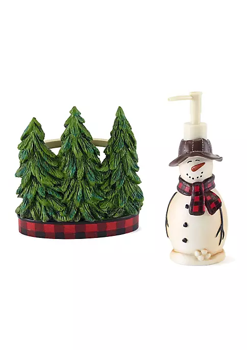 The Avanti Snowmen Gathering 2 Pc. Lotion Dispenser and Toothbrush Holder Set includes a figural snowman dispenser, complete with floppy hat, plaid scarf, carrot nose. The toothbrush holder features a trio of pine trees with a red and black plaid base. Beautifully detailed in hand-painted resin.