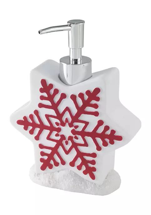 The Avanti Sparkle Lotion/Soap/Sanitizer Dispenser features a brick red snowflake on a white background on a star-shaped body sitting on a base of snow. It’s a perfect way to add a touch of the holidays to any bathroom, kitchen, or office.