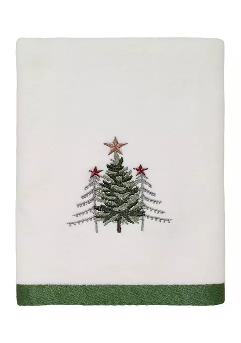The Avanti Trees Bath Towel features 3 embroidered pine trees in contrasting shades of green with gold stars on a 100% cotton (exclusive of embellishment and border) white velour towel. Towel is finished with a coordinating green polyester border. Imported.