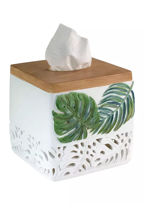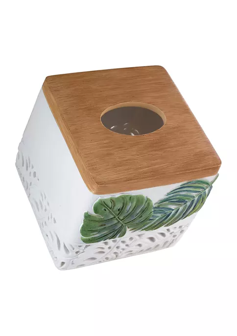 The Avanti Viva Palm Tissue Box Cover features a textural white leaf cut-out background with 2 large three-dimensional tropical leaves in multiple shades of green. The top edge is decorated with a faux-wood finish. Made of durable, hand-painted resin for long-lasting use.