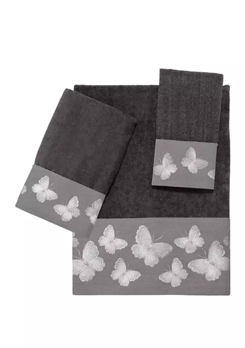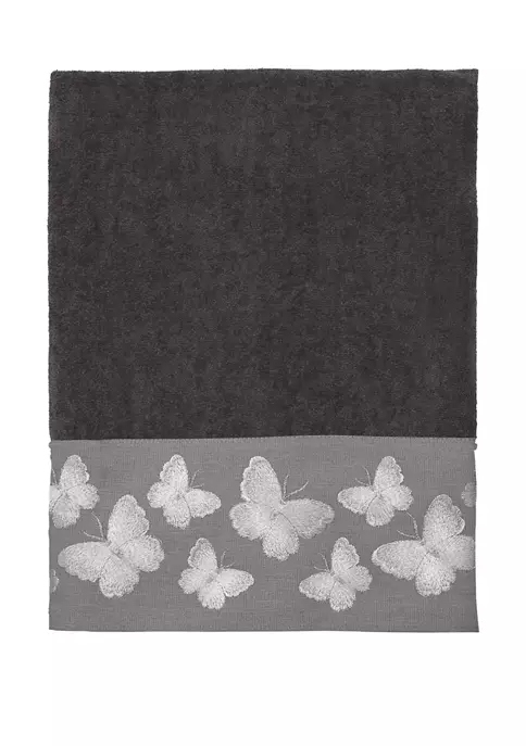 The Avanti Yara bath towel features a series of delicately embroidered white butterflies on a grey border attached to a granite velour towel.